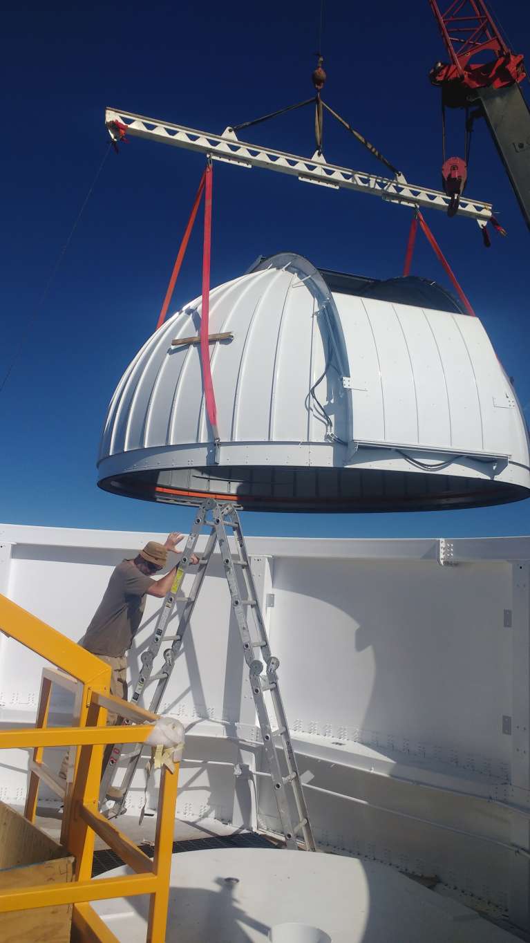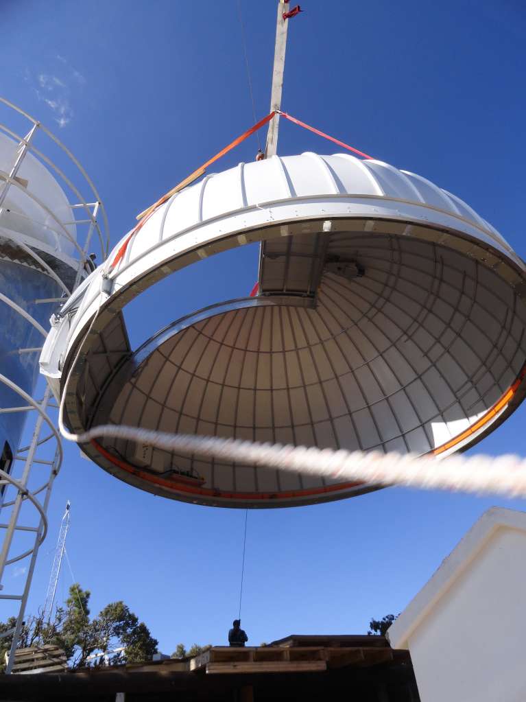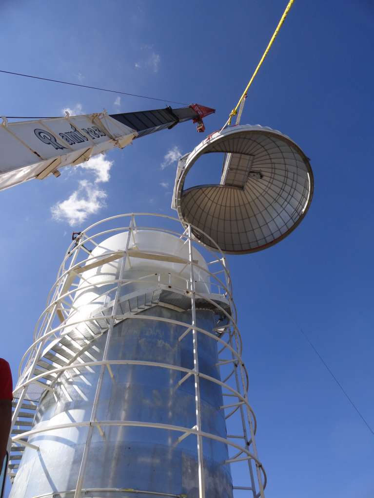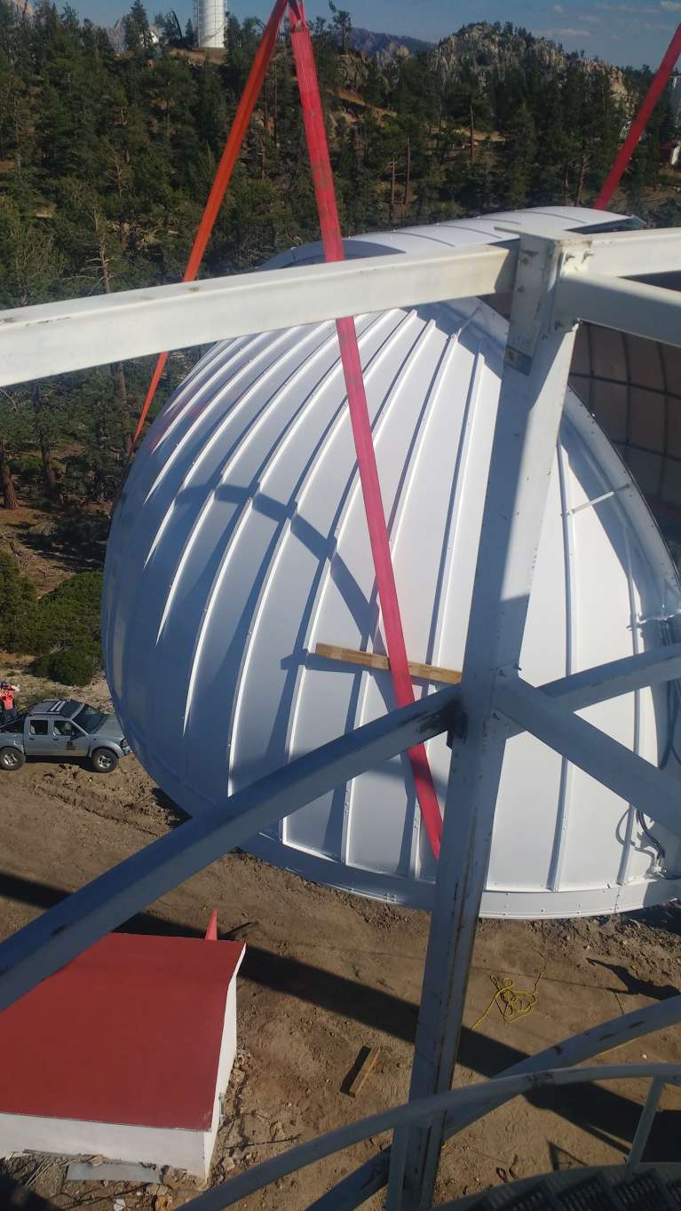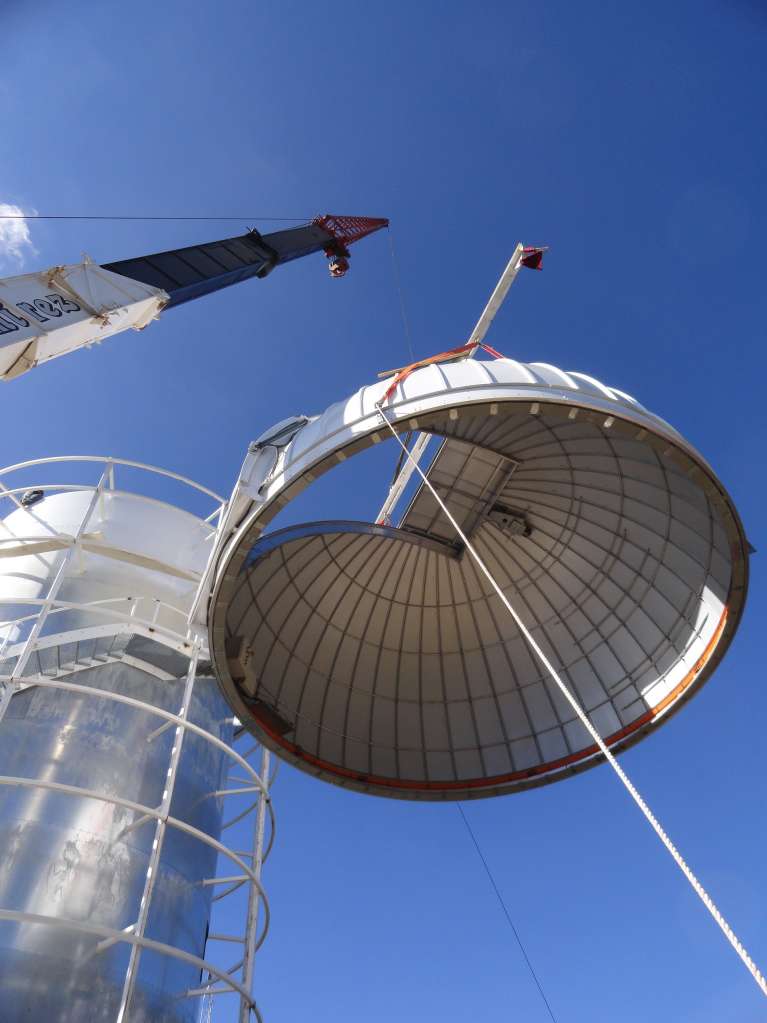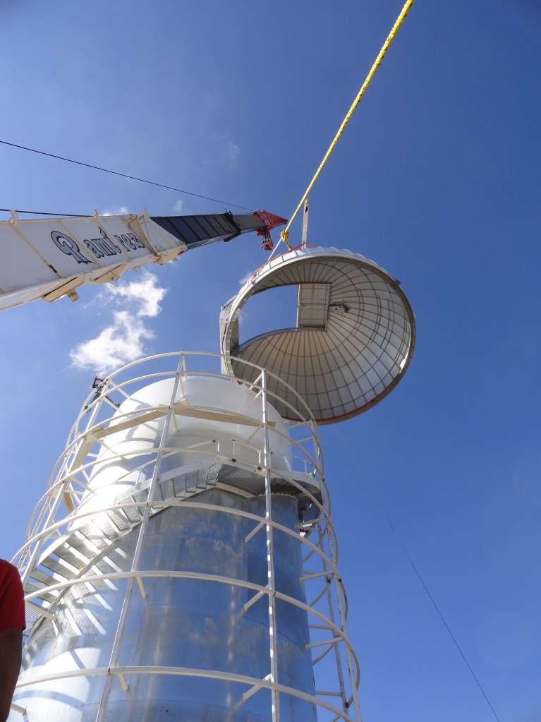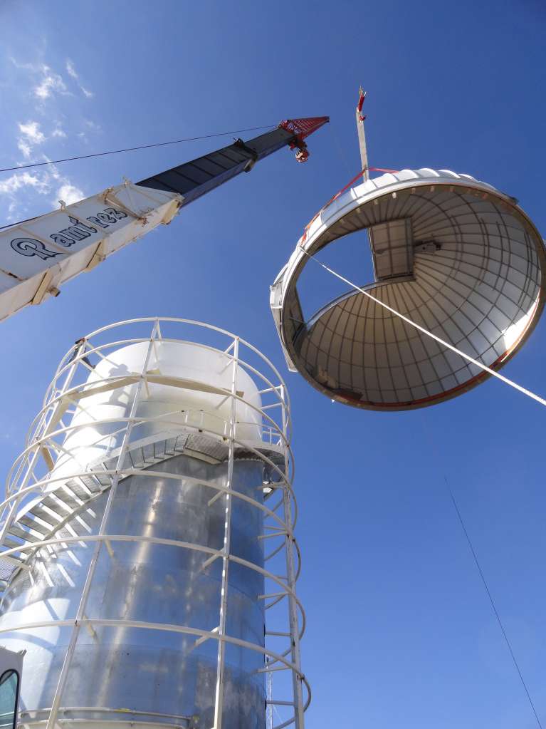 The dome at Site #1 was lifted into place yesterday. The lift went well, although it started getting a bit scary at the end since the wind started picking up while we were setting the dome down. The dome fit into place fairly easily, and it was successfully bolted down onto the ring beam. We will level the dome and install the power tomorrow. Here are some photos.