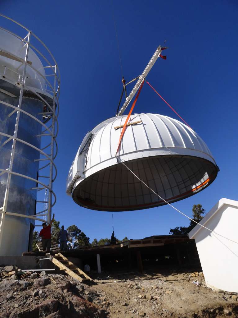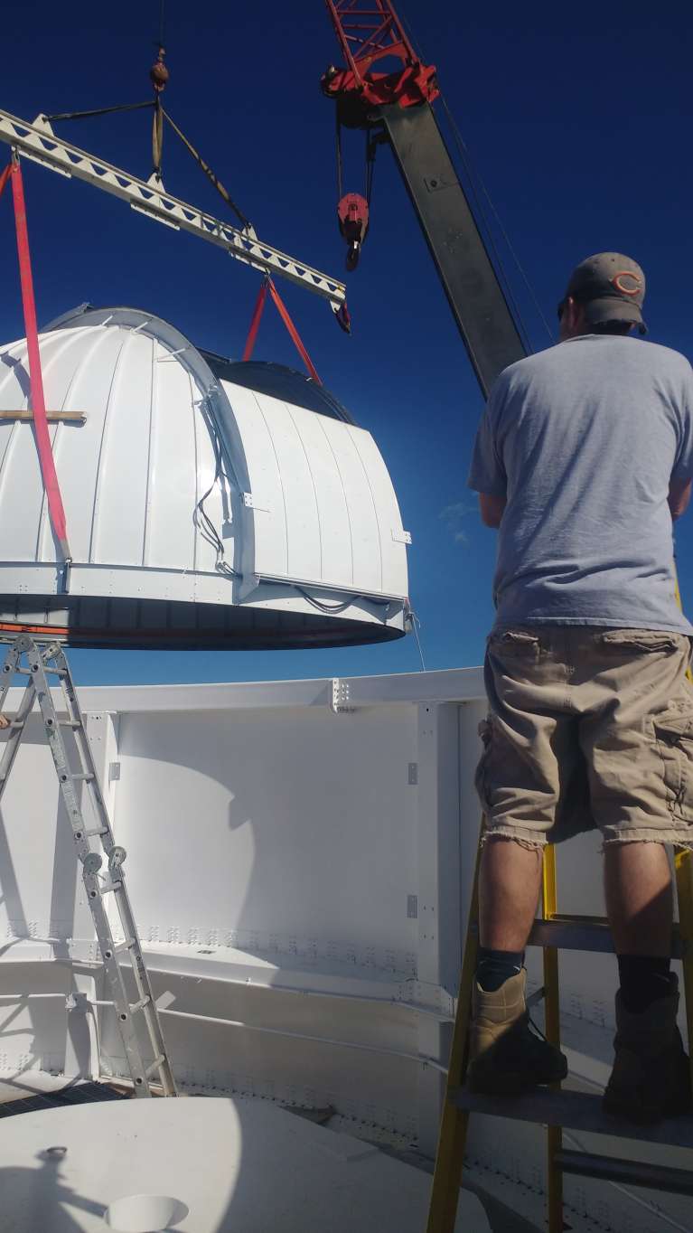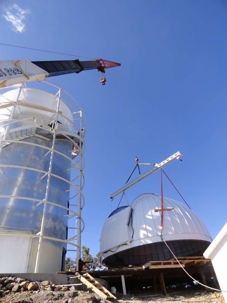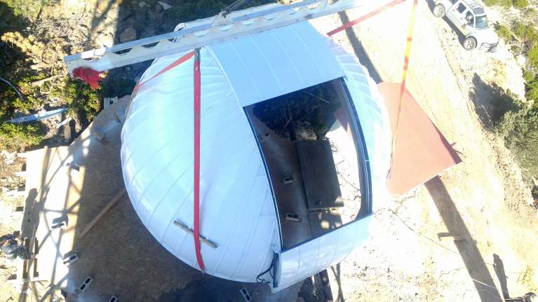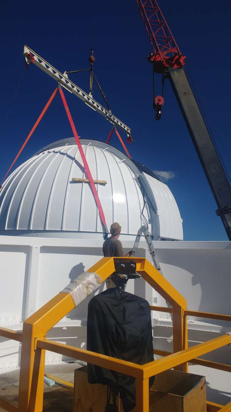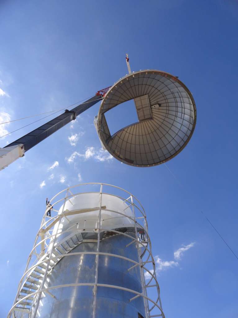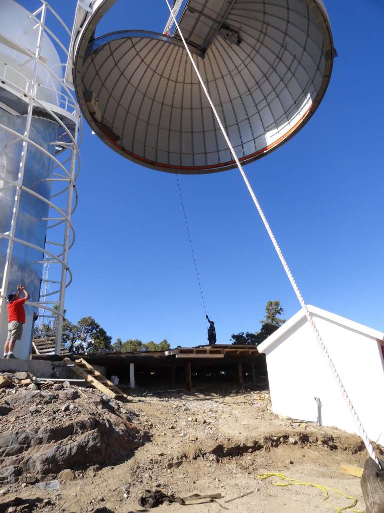 The dome at Site #1 was lifted into place yesterday. The lift went well, although it started getting a bit scary at the end since the wind started picking up while we were setting the dome down. The dome fit into place fairly easily, and it was successfully bolted down onto the ring beam. We will level the dome and install the power tomorrow. Here are some photos.