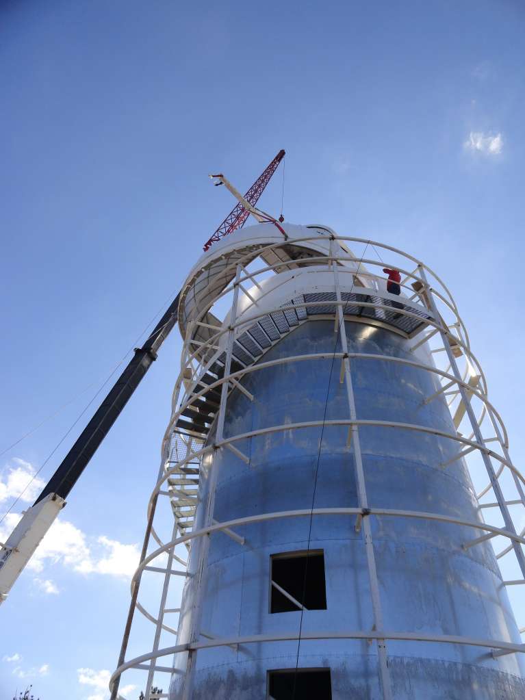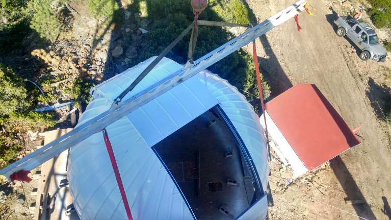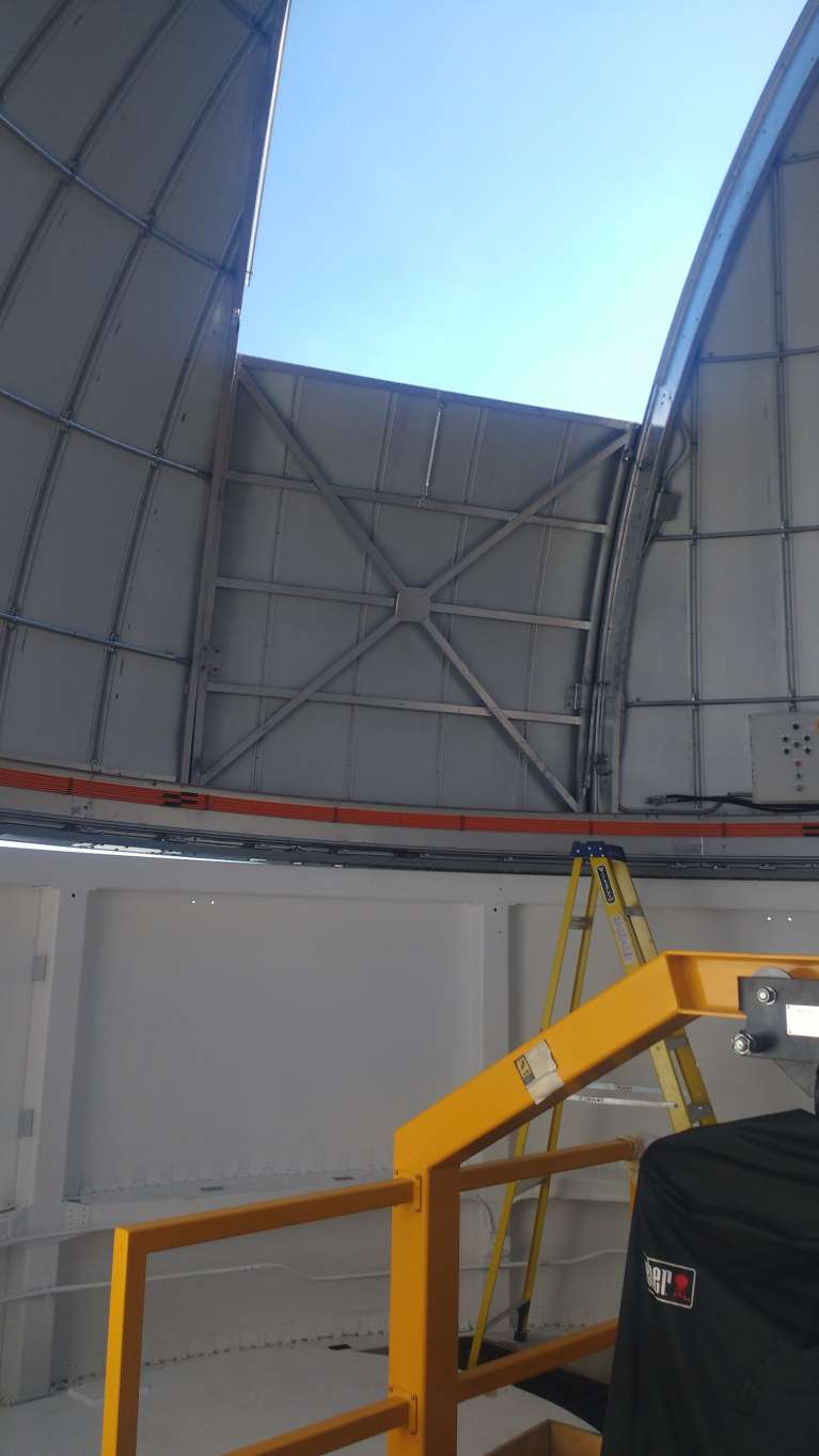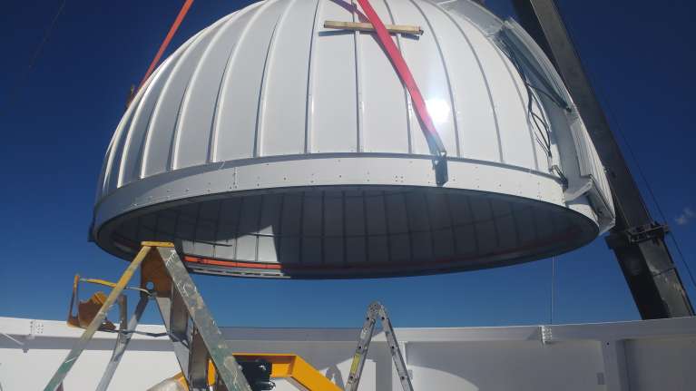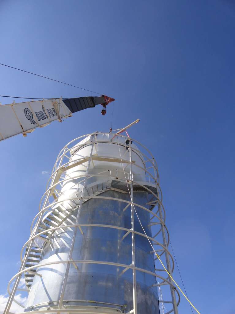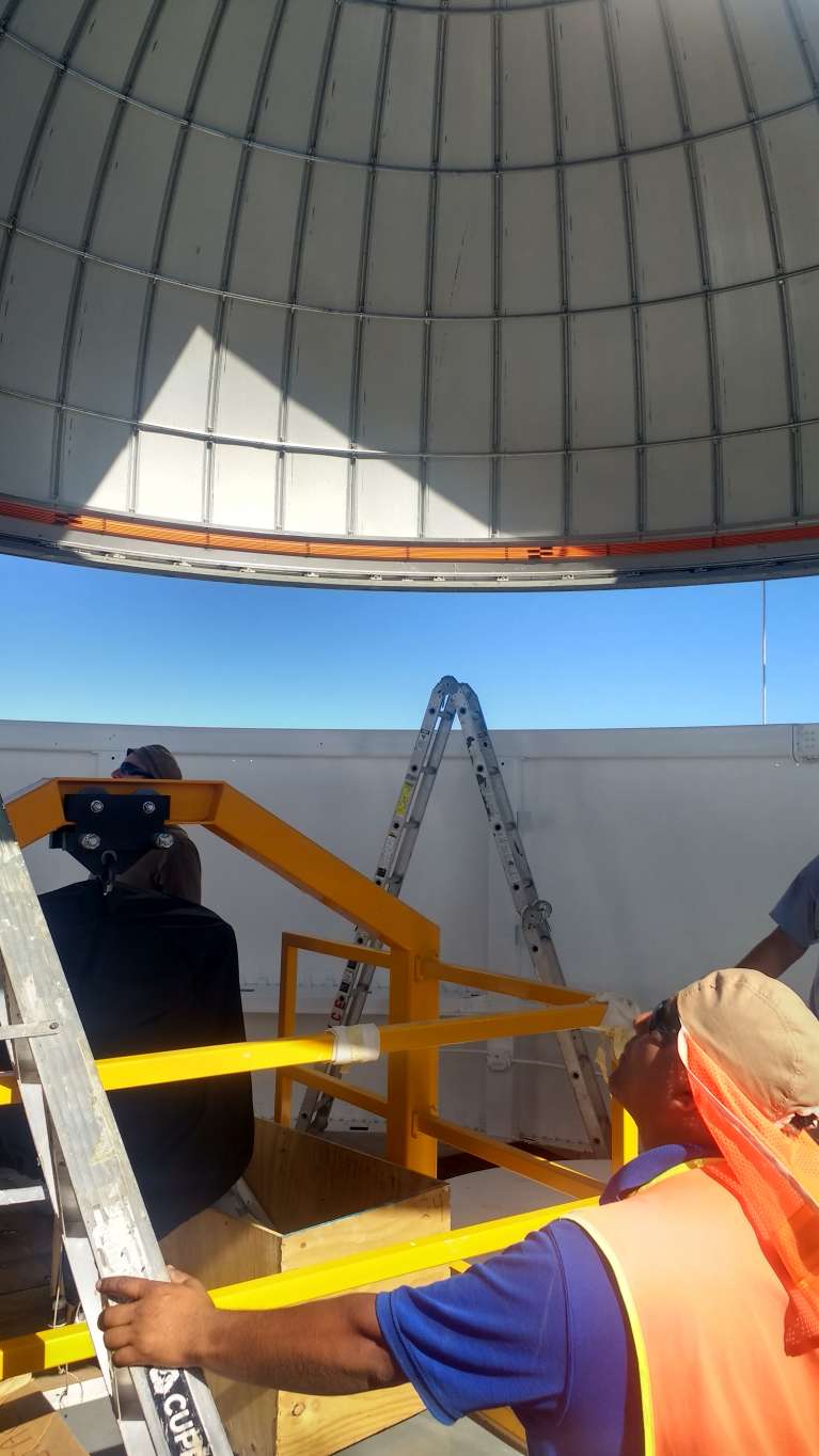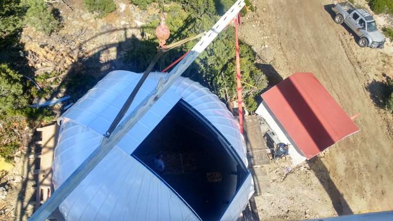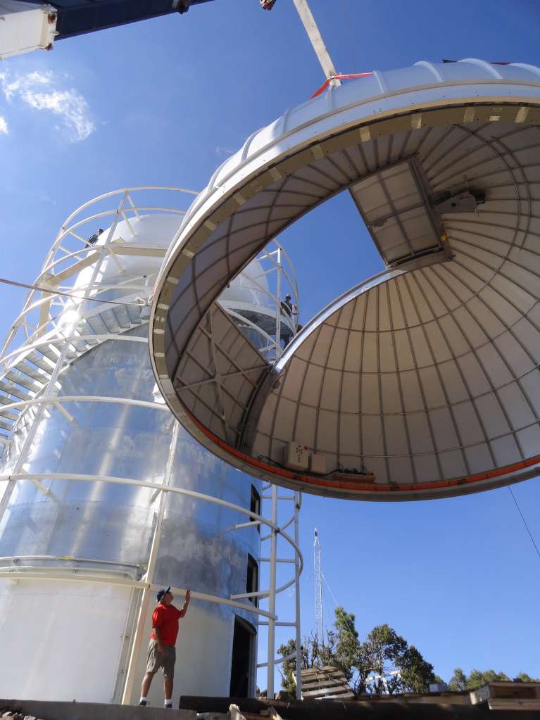 The dome at Site #1 was lifted into place yesterday. The lift went well, although it started getting a bit scary at the end since the wind started picking up while we were setting the dome down. The dome fit into place fairly easily, and it was successfully bolted down onto the ring beam. We will level the dome and install the power tomorrow. Here are some photos.