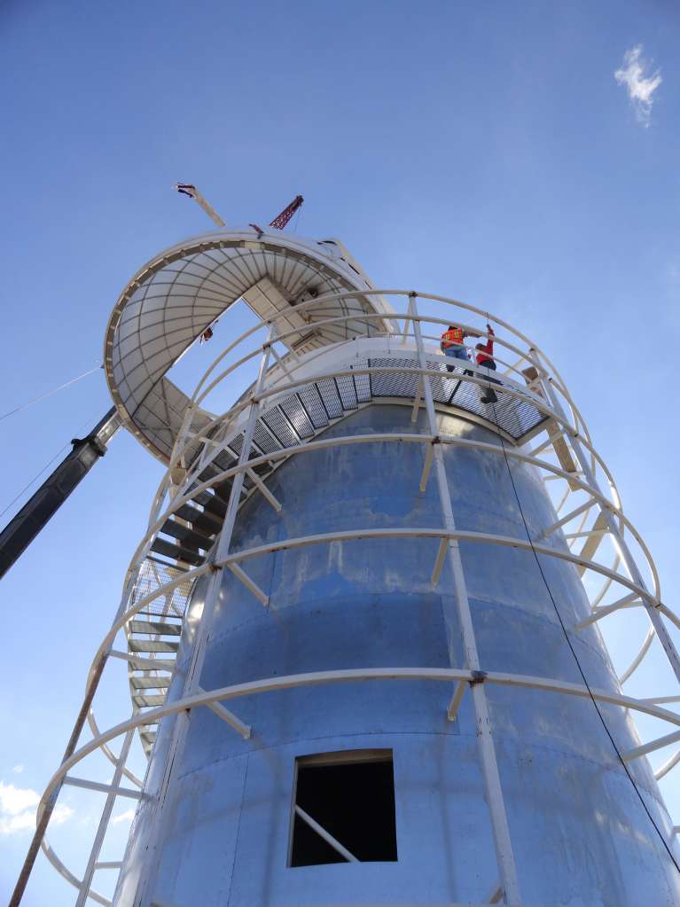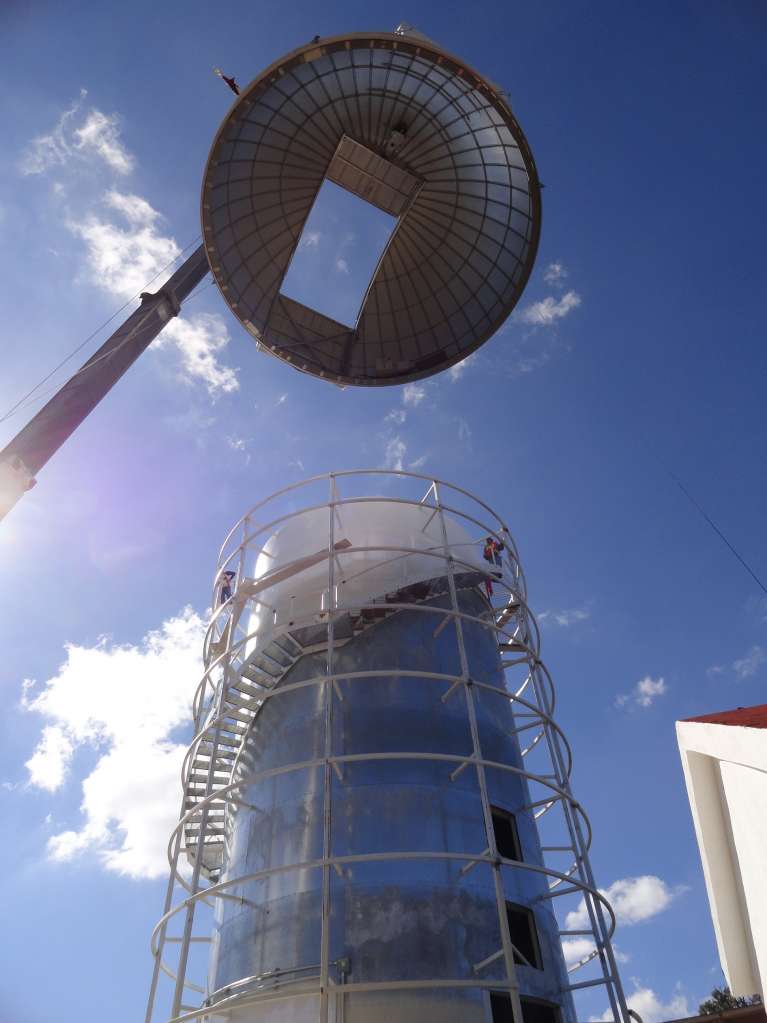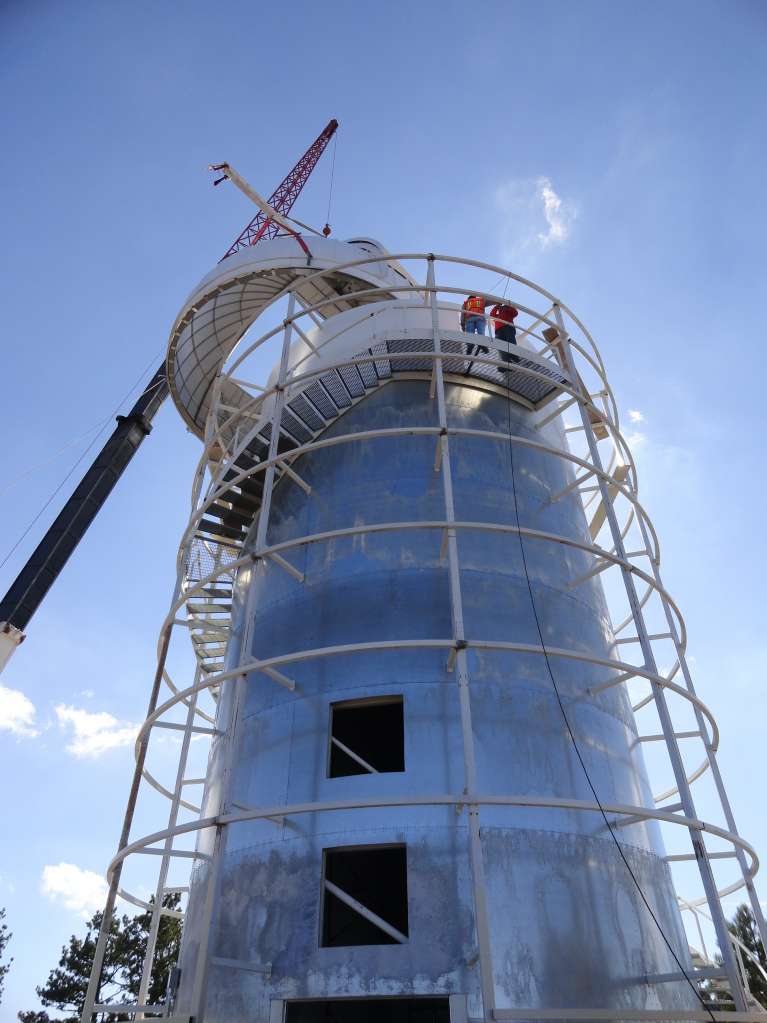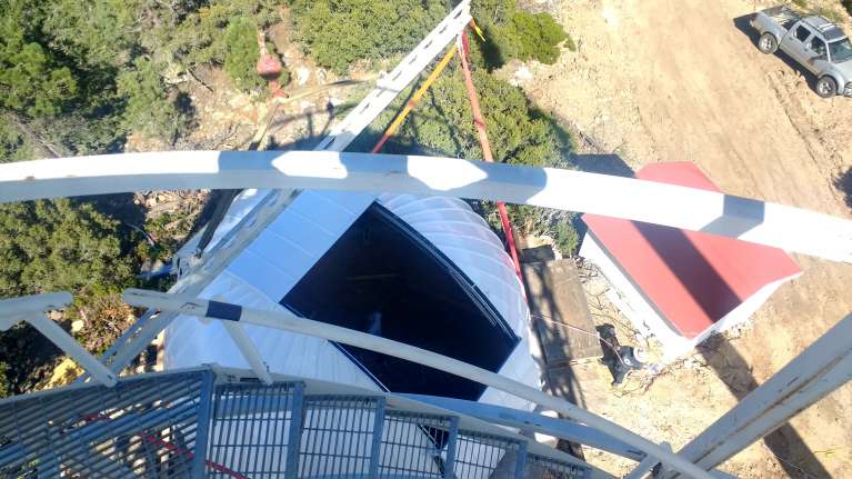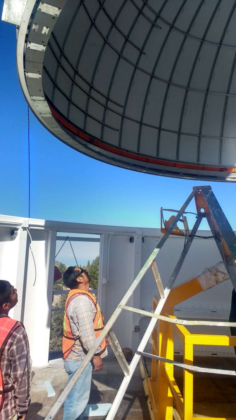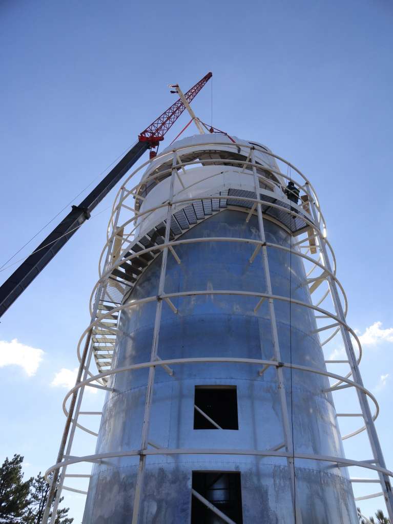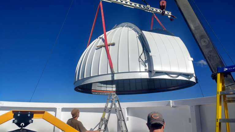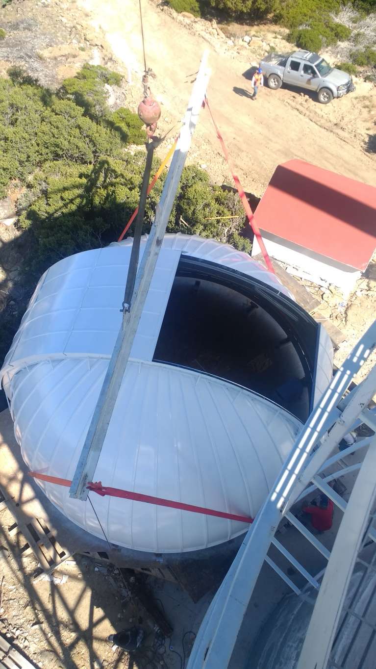 The dome at Site #1 was lifted into place yesterday. The lift went well, although it started getting a bit scary at the end since the wind started picking up while we were setting the dome down. The dome fit into place fairly easily, and it was successfully bolted down onto the ring beam. We will level the dome and install the power tomorrow. Here are some photos.