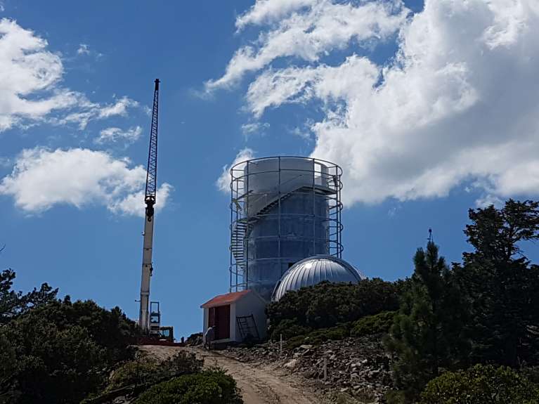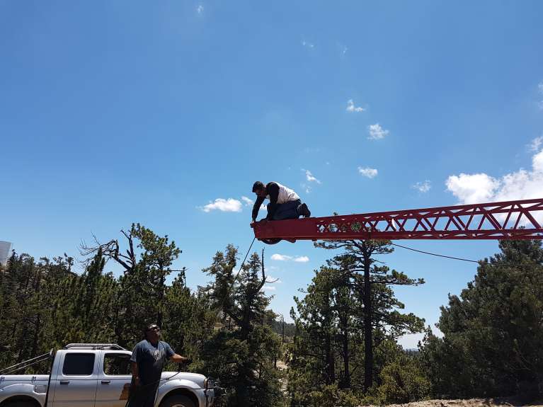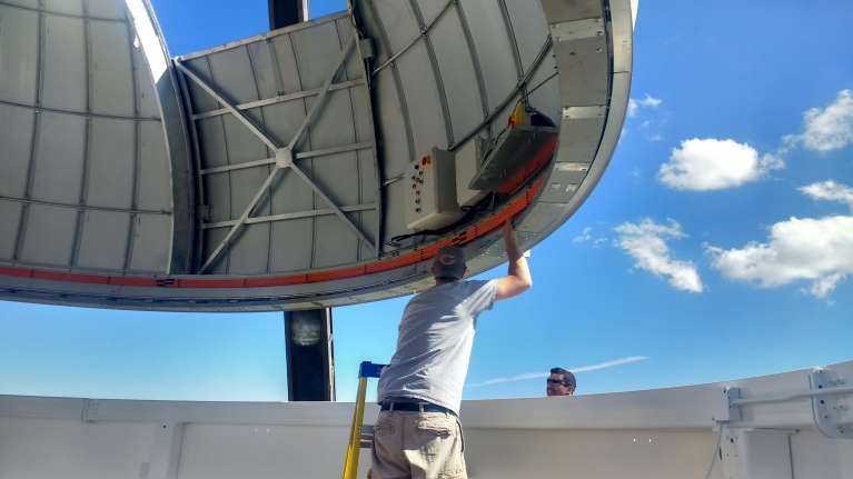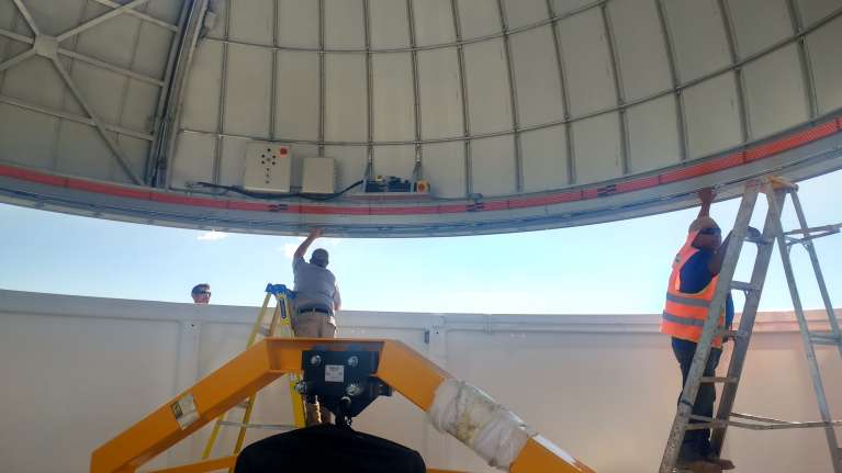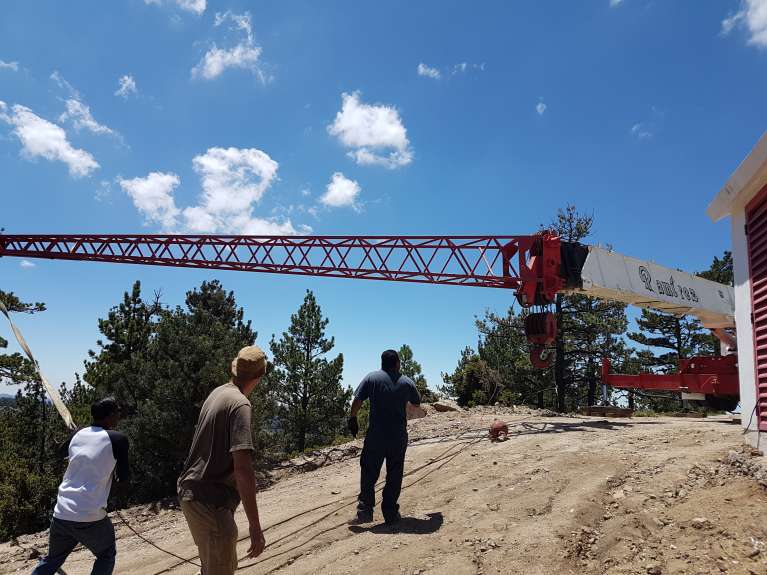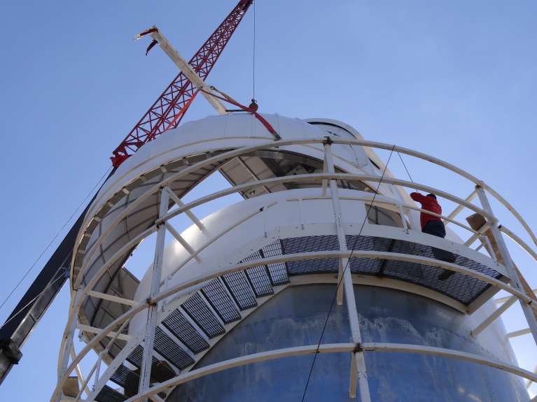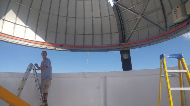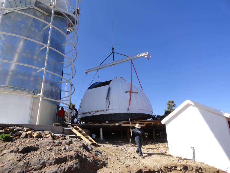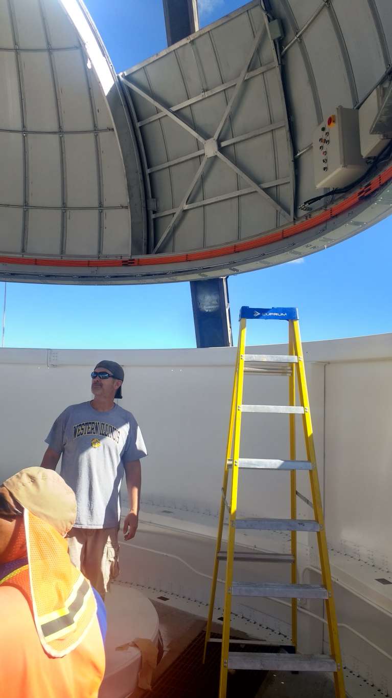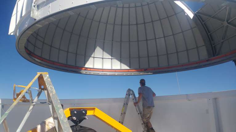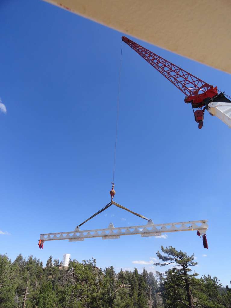 The dome at Site #1 was lifted into place yesterday. The lift went well, although it started getting a bit scary at the end since the wind started picking up while we were setting the dome down. The dome fit into place fairly easily, and it was successfully bolted down onto the ring beam. We will level the dome and install the power tomorrow. Here are some photos.