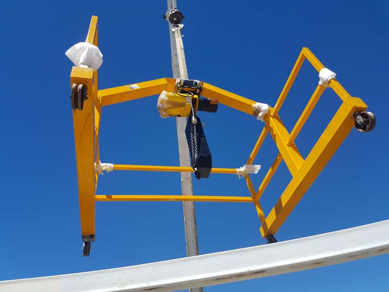 We installed the gantry cranes, including the hoists in all three enclosures today. We welded the rails down to the main floor joists at Site #1, but we will do the welding at the other sites later. Photos below.