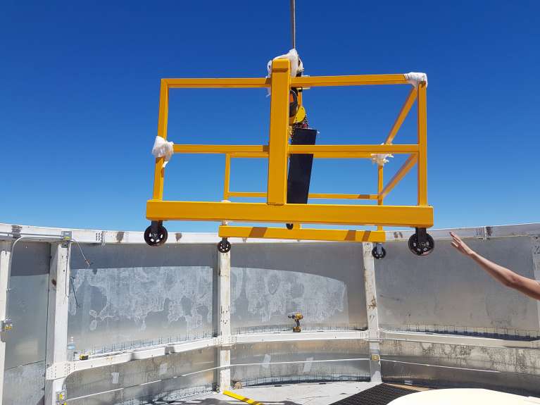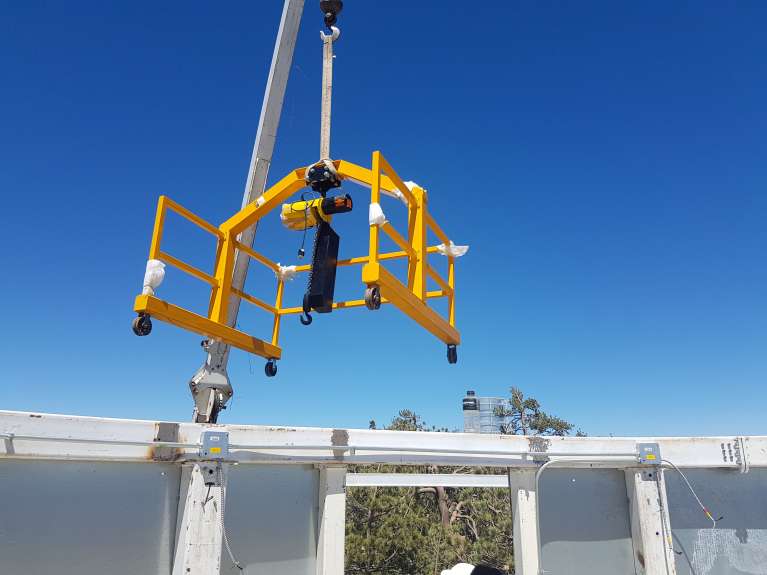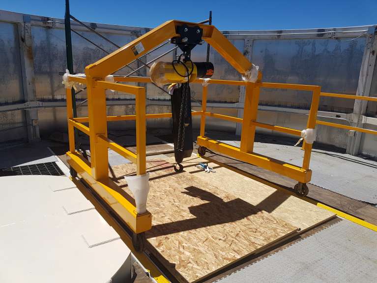 Gantry crane resting on rails at top of enclosure #2.