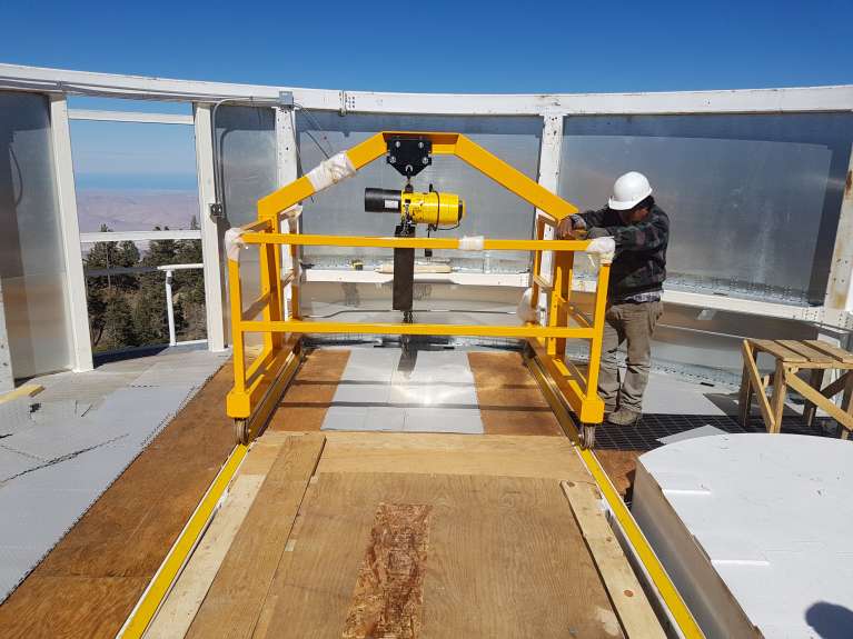 Gantry crane resting on rails at top of enclosure #1.