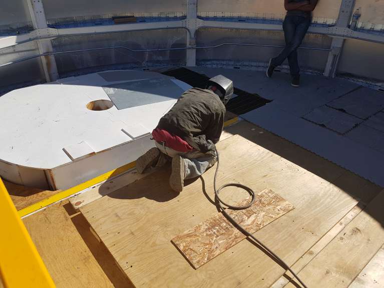 Welding gantry crane rails into place.