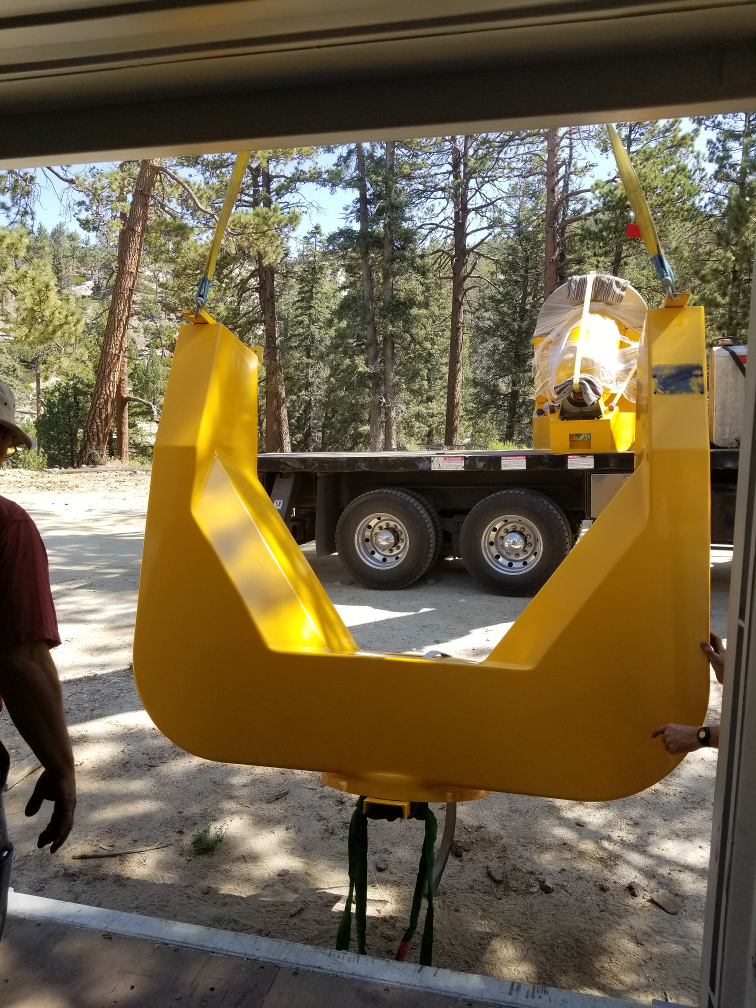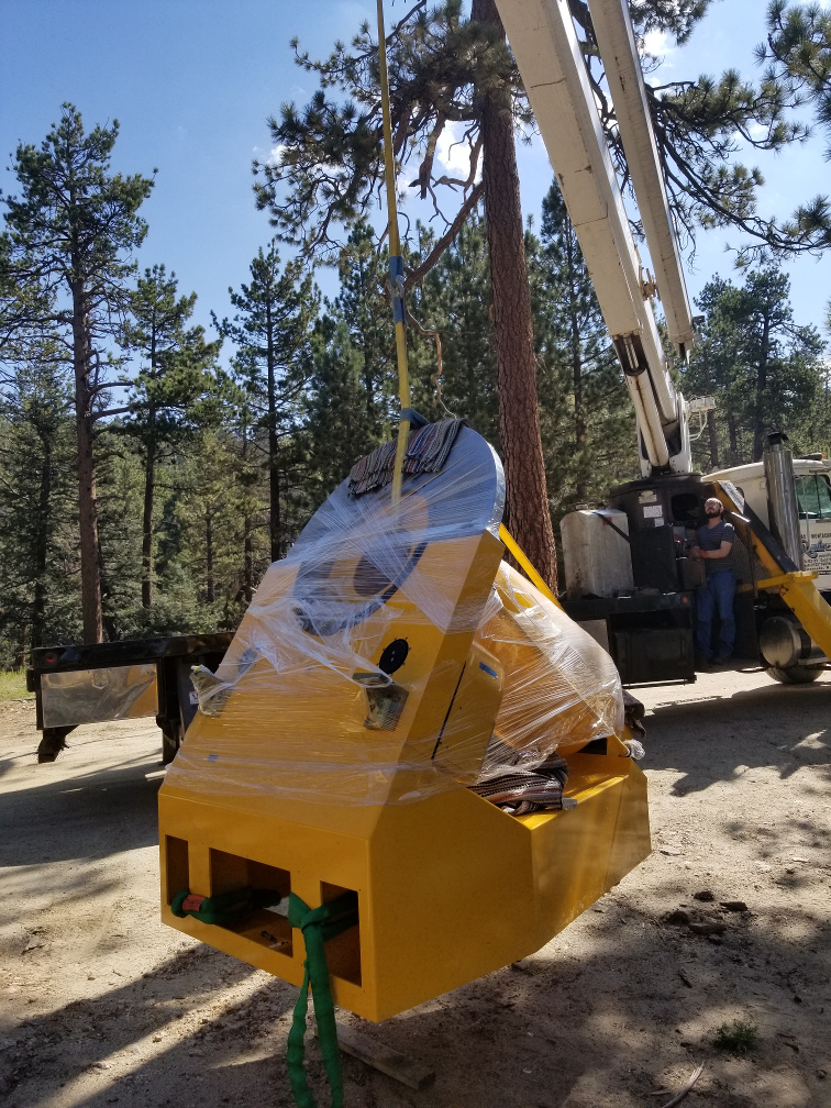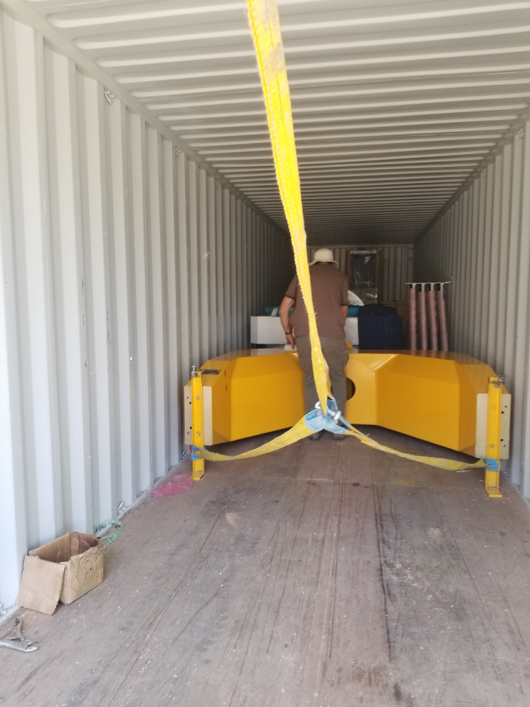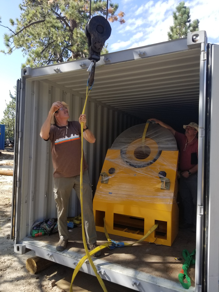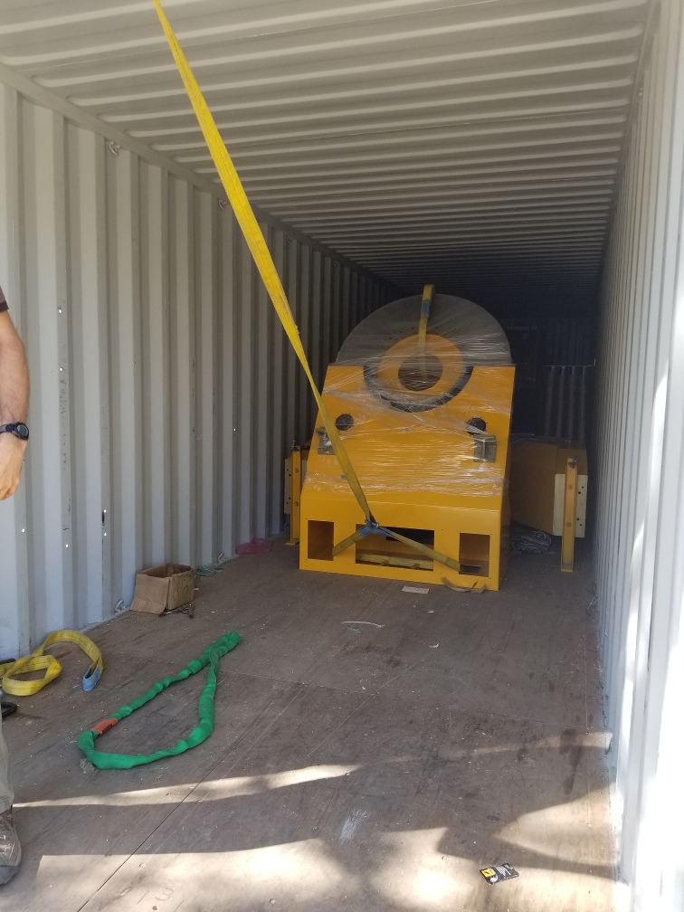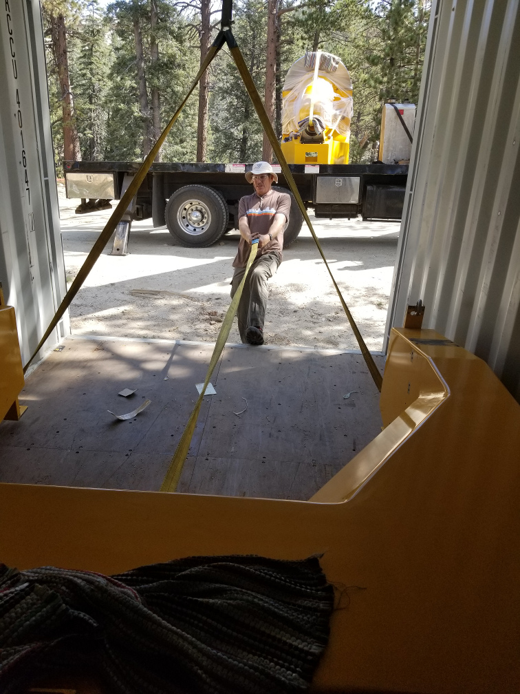 Rigging the pedestal to drag it out of the shipping container.