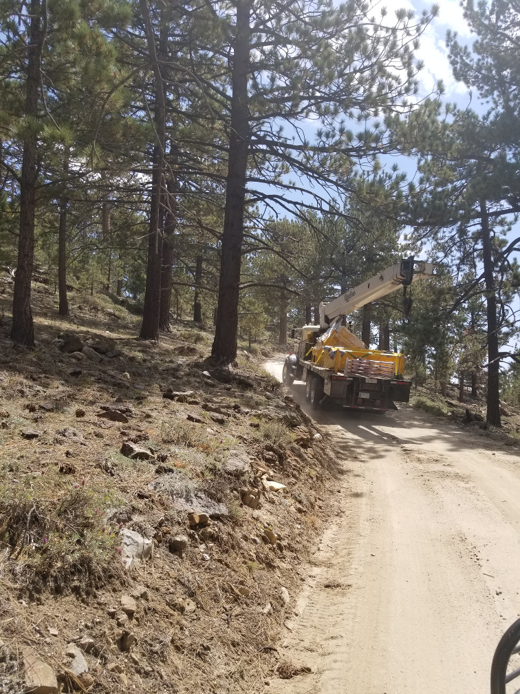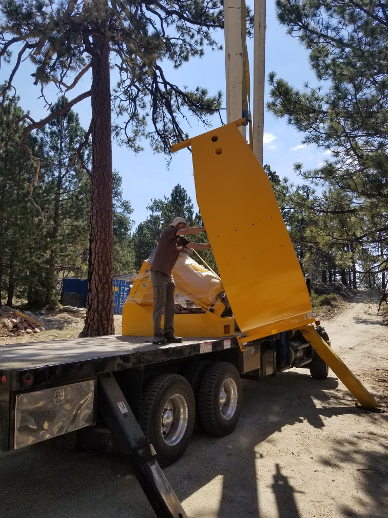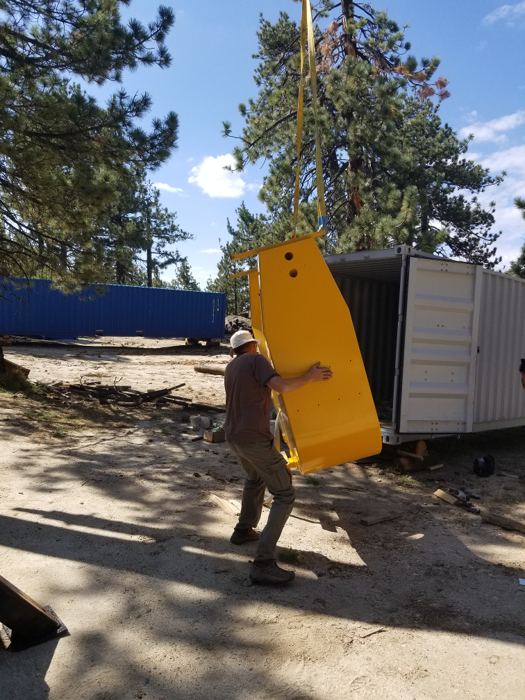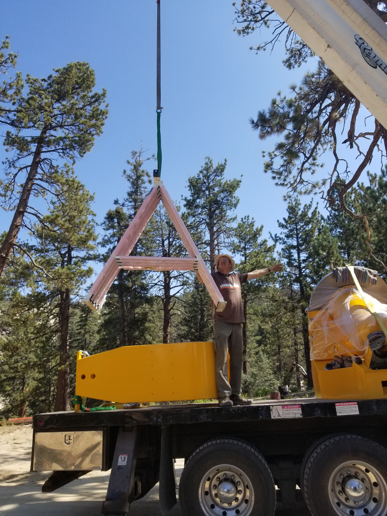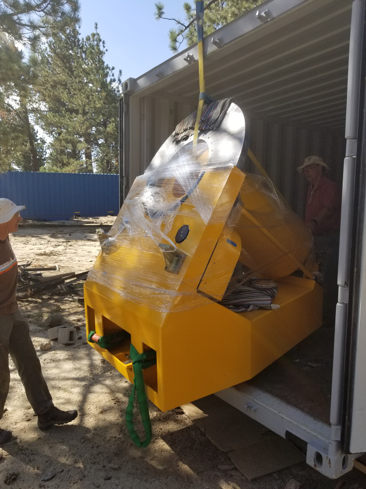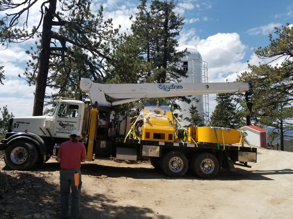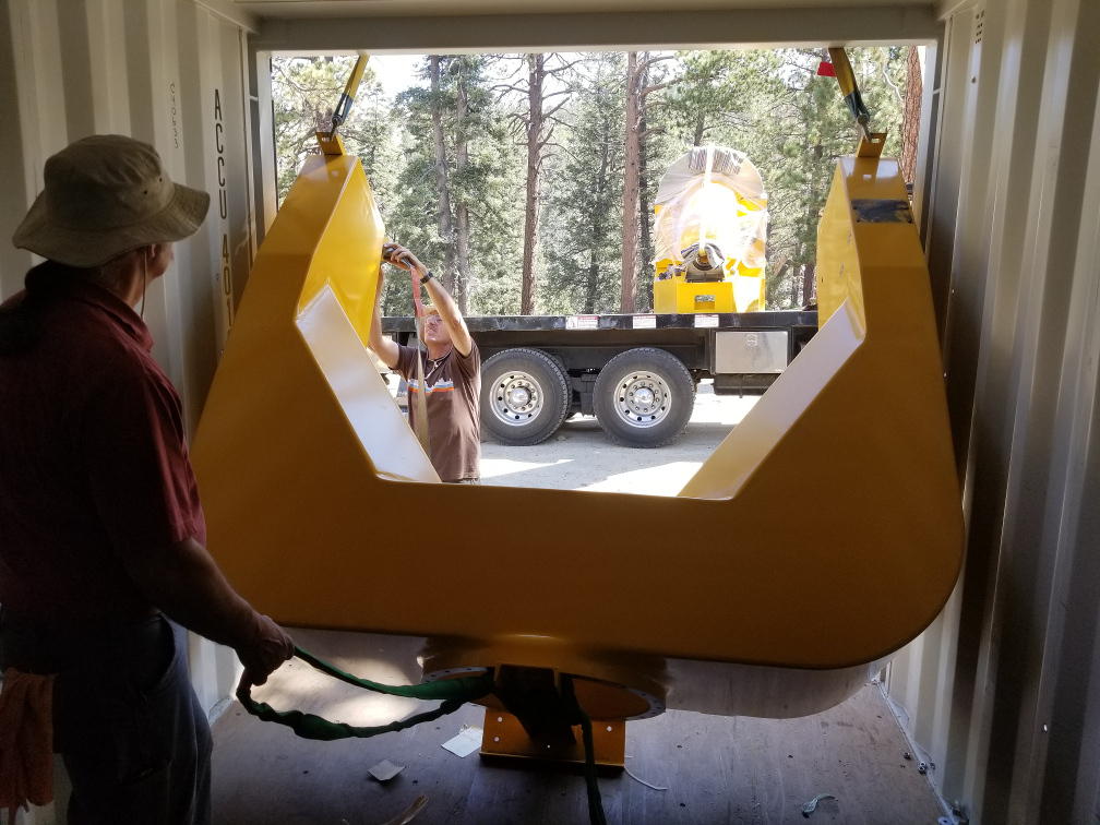 We finished preparations for the telescope installation yesterday. All the pier holes are finished, and the domes, lift tables, and hoists are all operational. The cranes also arrived yesterday. (We are using two cranes: a large crane to do the lifting and a smaller crane with a flatbed to pull the parts from the containers and transload them to the sites.) The small crane arrived at the observatory last night, while the large crane made it as far as the park entrance since it needed to be delivered on a large flatbed trailer. This morning we began the work of transloading the telescope pedestal, fork, trusses, HA counterweight, and the spreader bar to lift the primary mirror cell, while another guy from the crane crew went back to the park entrance to get the big crane. Unfortunately, the big crane had a problem with the fuel pump so it could not get up here this morning. Good news is, one of the SPM mechanics went back down to the park entrance and was able to fix it, and the crane arrived at the observatory late this afternoon. We did not have any time to do any lifting, but we will start early tomorrow morning. We expect to get everything in place by the end of the day.