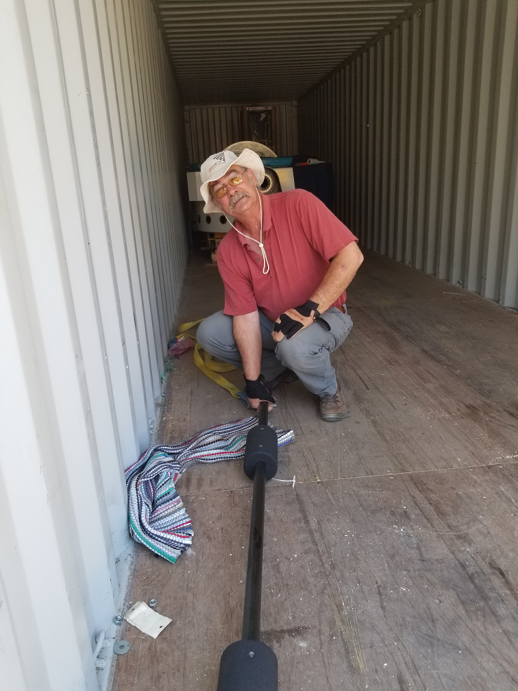 Justus helping me get the counterweight assembly out of the container.