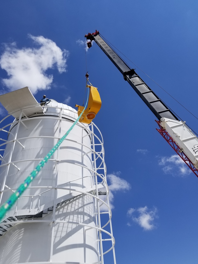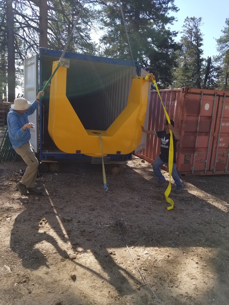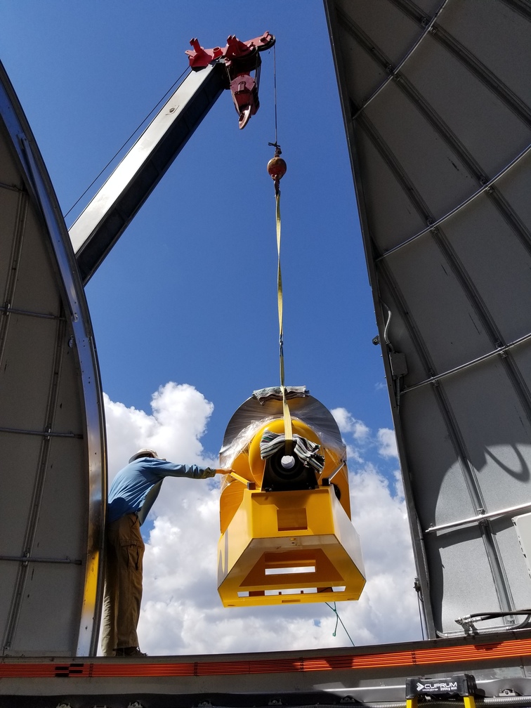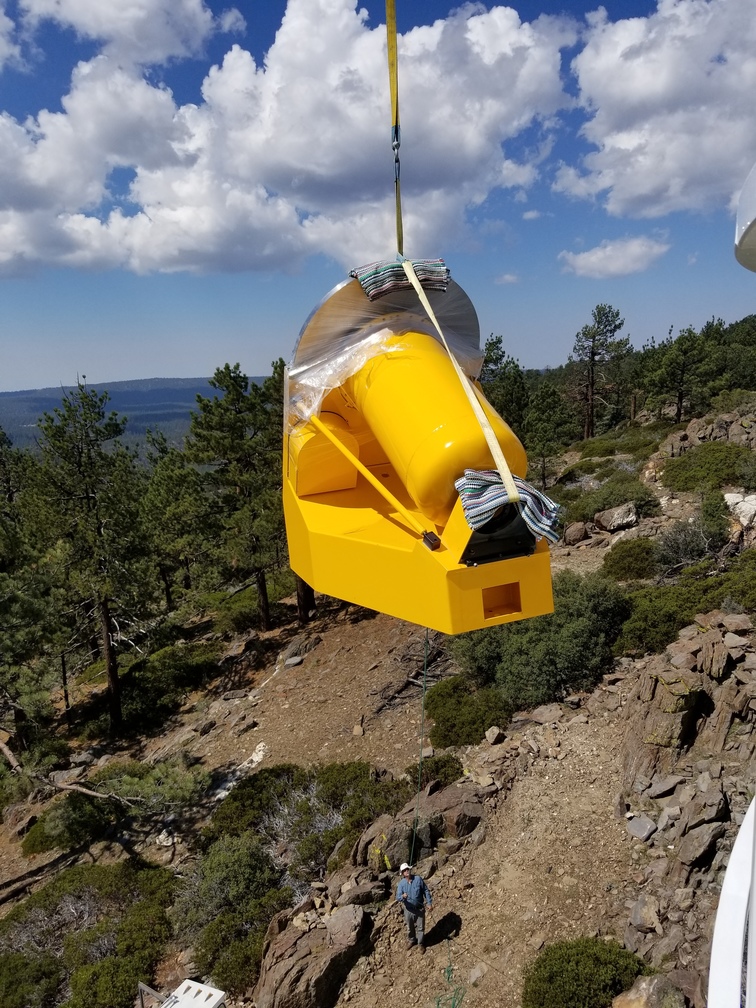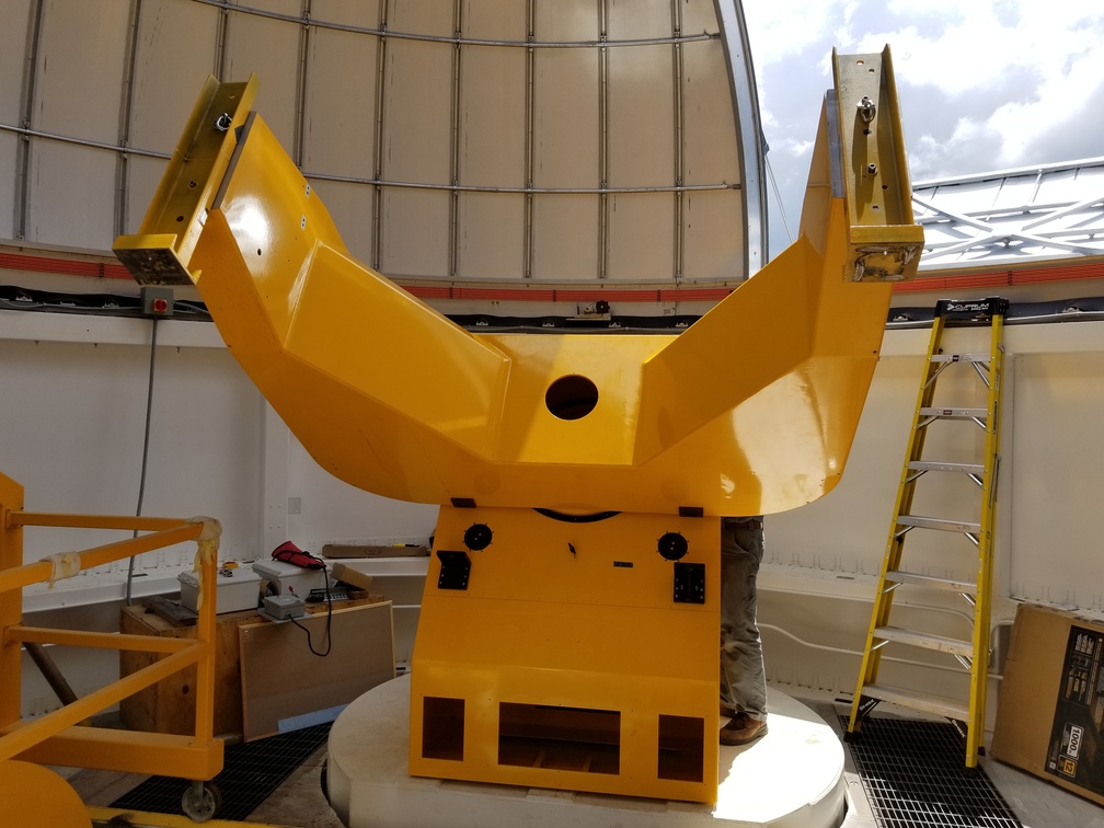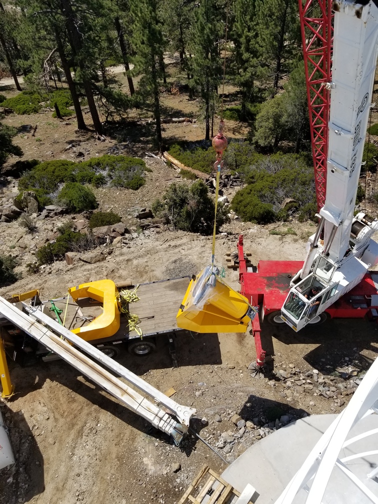 We installed the pedestal and fork at Site #1 this morning. We got the primary mirror cell/center section/focus housing stack loaded onto the flatbed and up to the site for installation this afternoon, but a thunderstorm came through so we covered everything with a tarp and called it a day. We will get back to work tomorrow morning.