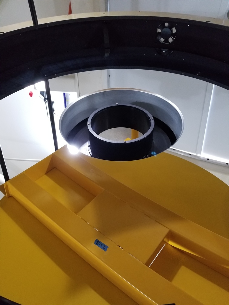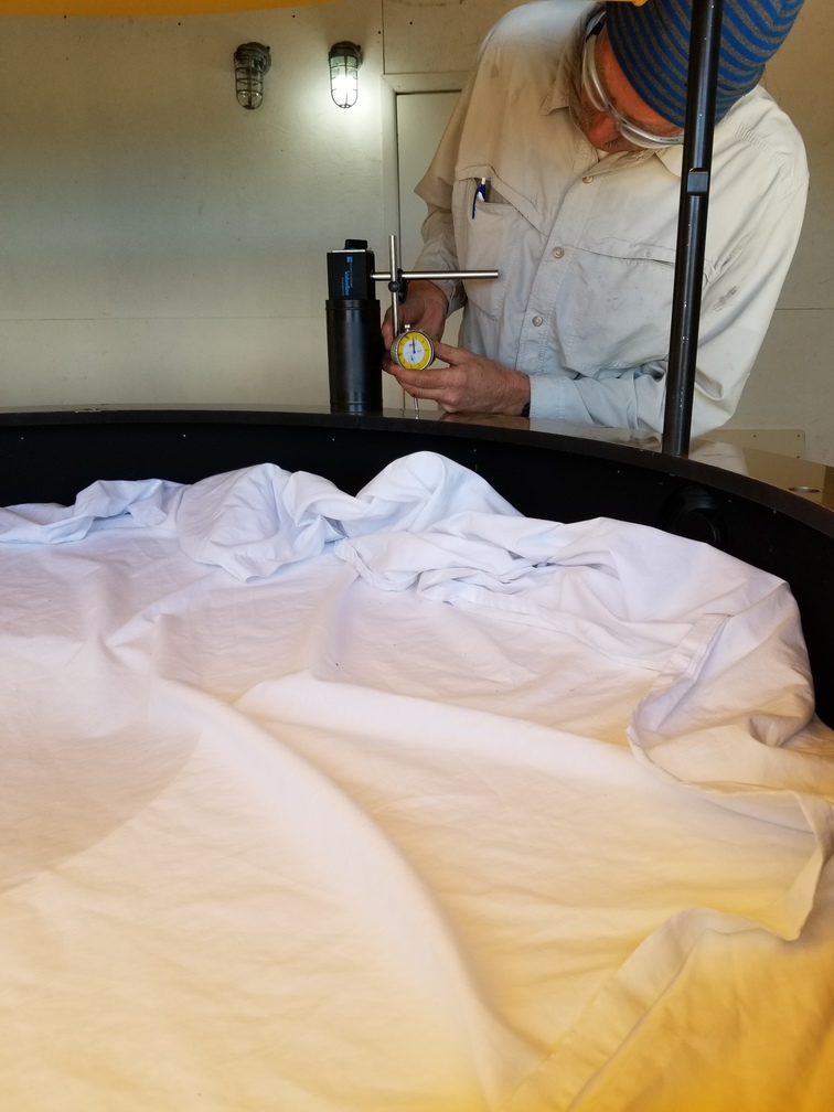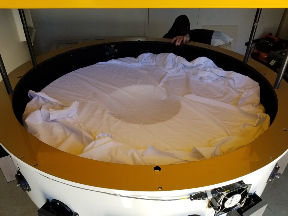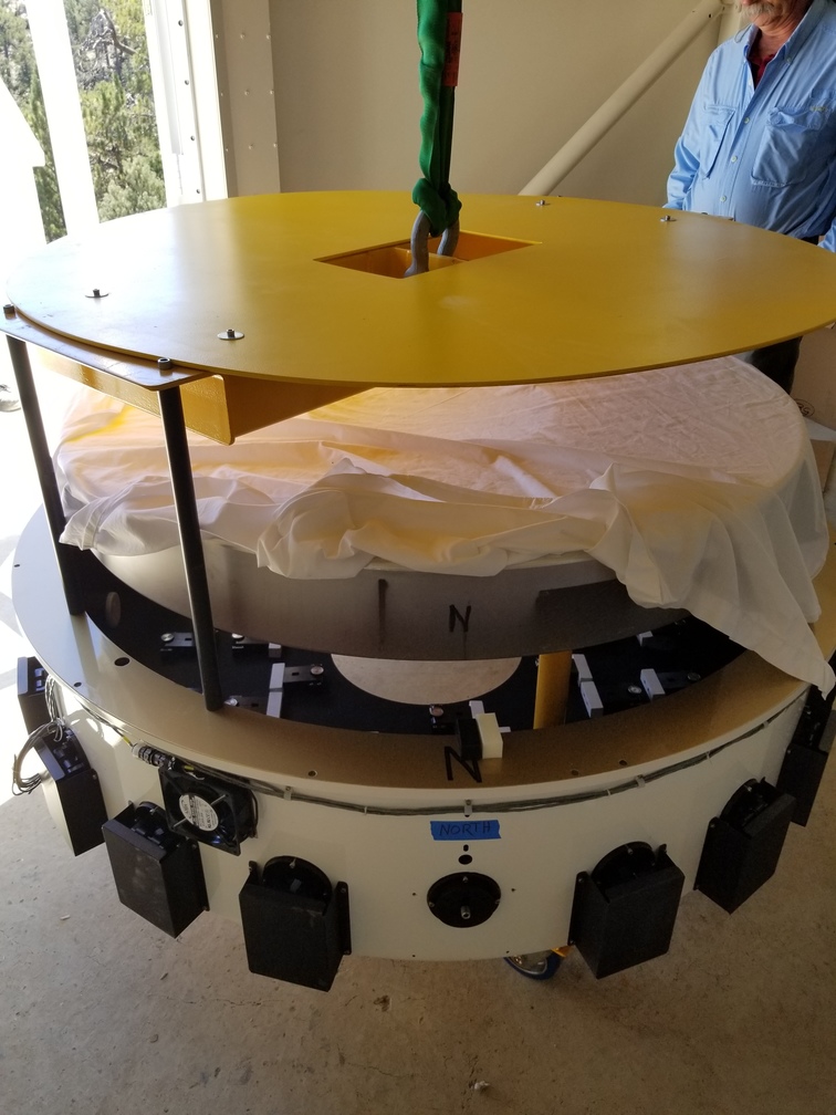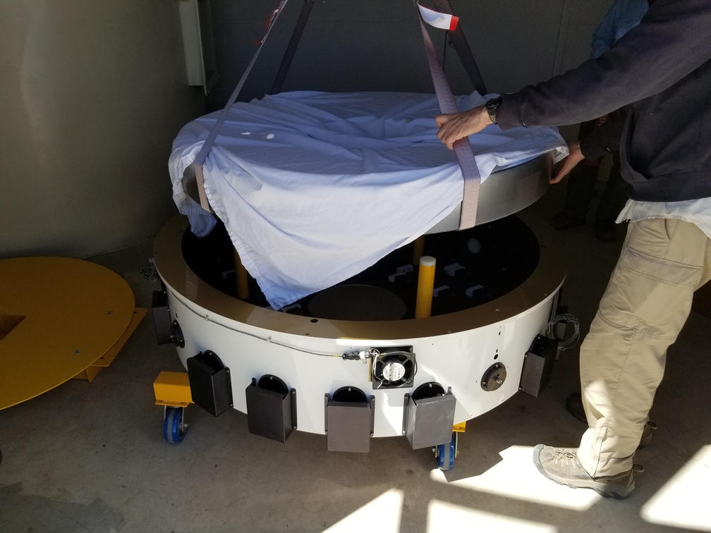We started installation of the primary mirror into the mirror cell at Site #1 this morning. We got the mirror centered and leveled relative to the mirror cell, then at the end of the day we were able to glue the blocks onto the side of the mirror which are attached to the radial support arms. We left the mirror cell covered with a space heater underneath to help cure the glue overnight, and we plan to install the mirror cell onto the telescope in the morning. After that, we will work on getting the secondary mirror installed.