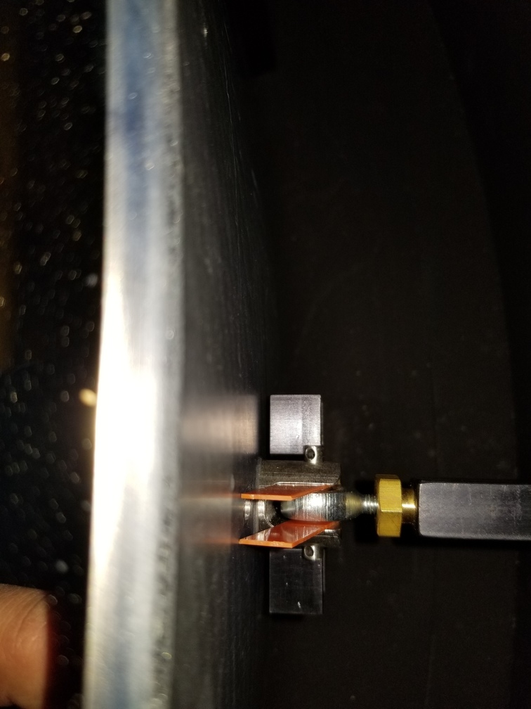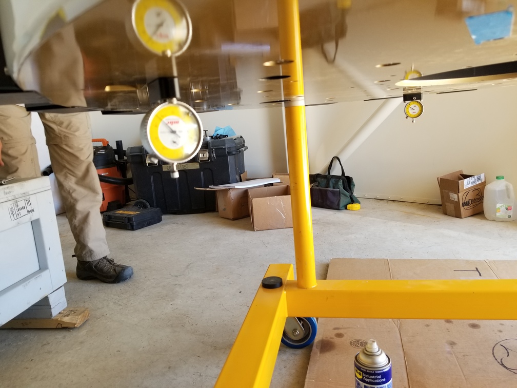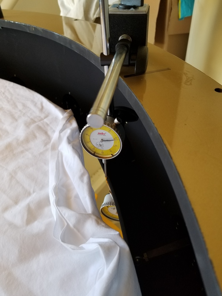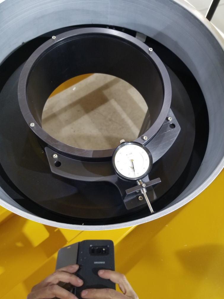 Using the dial indicator set to the reference position to measure distance to top of mirror, so we can adjust leveling.