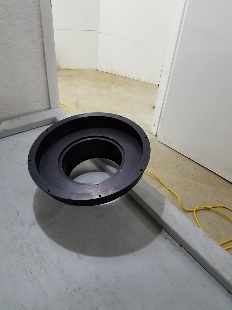 Field corrector cell. This bolts to the bottom of the mirror cell and extends through the hole in the bottom of the primary mirror. It provides a reference surface against which we center the mirror in the cell.