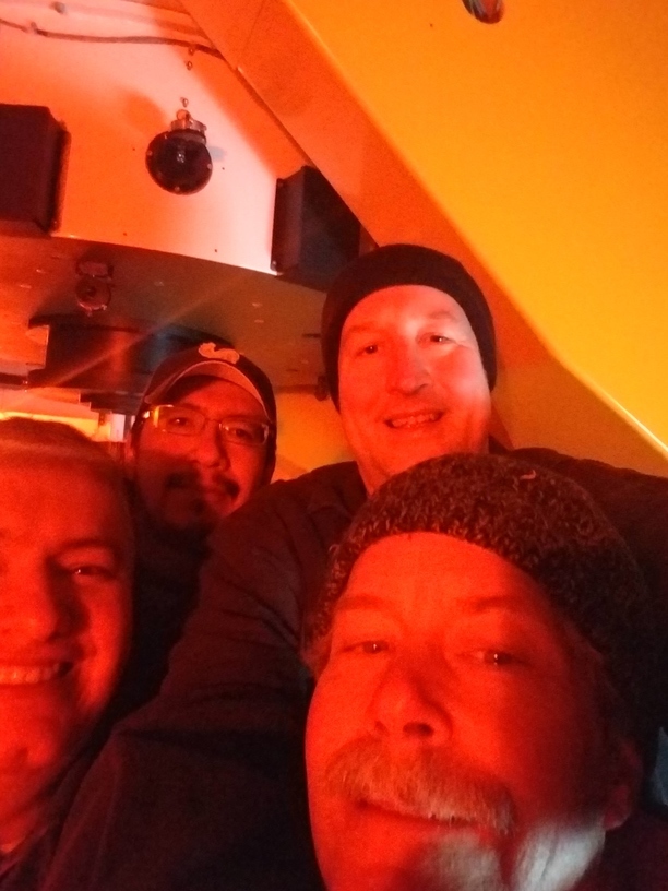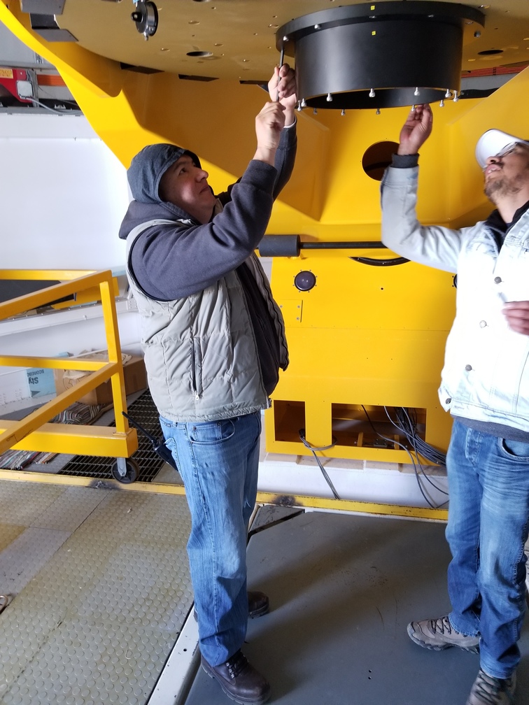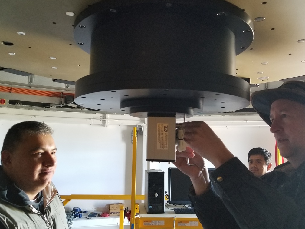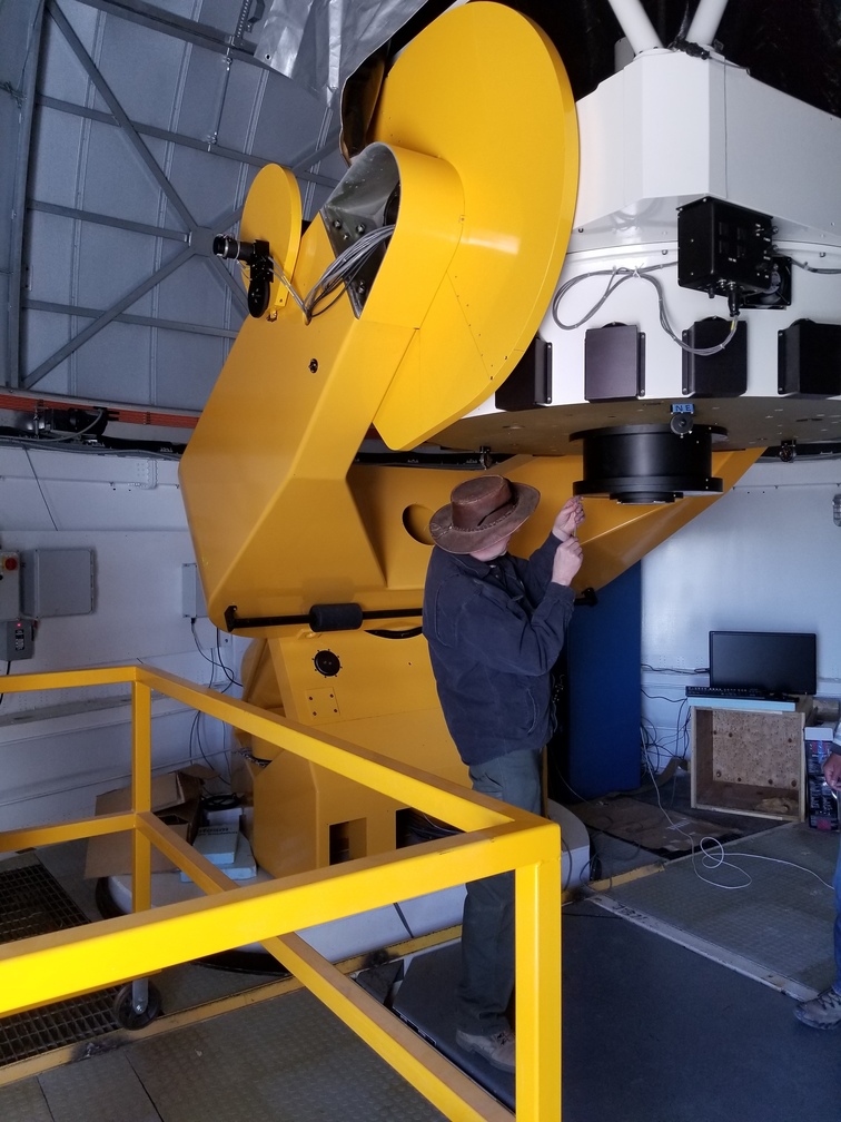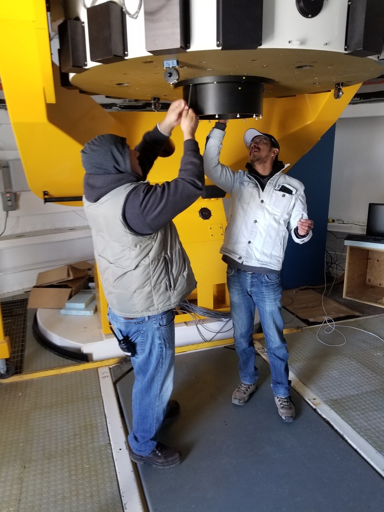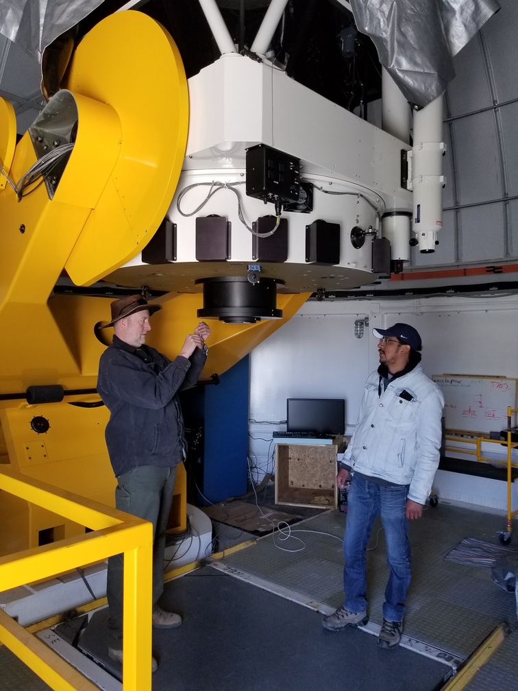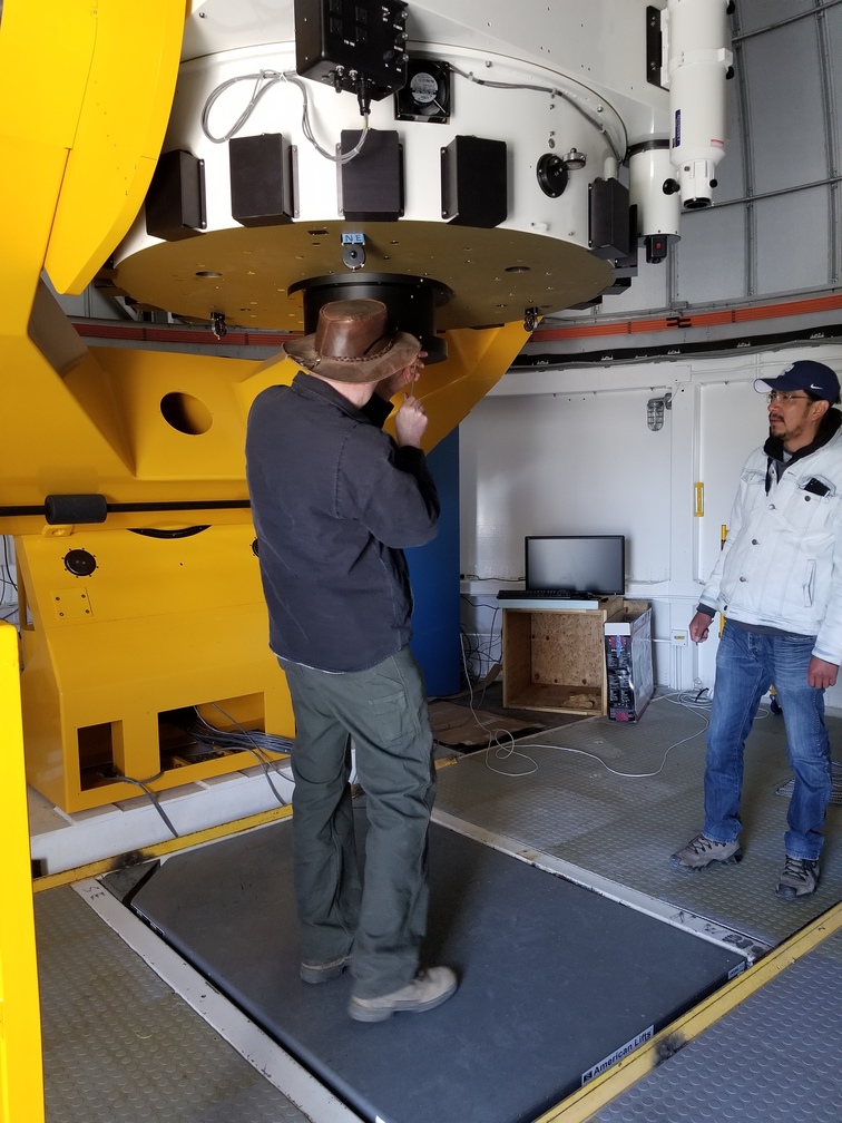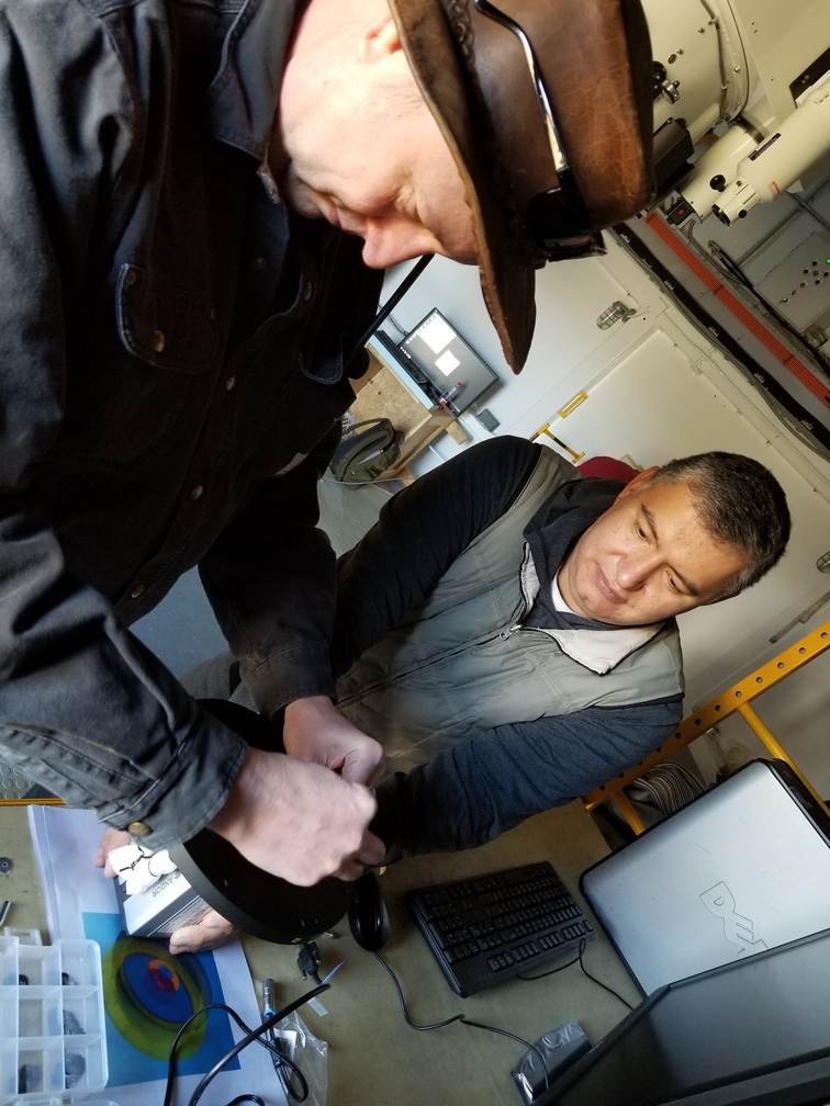 Enrique and Bosco installing camera mounting fixture on telescope.