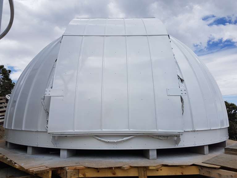 The crane company sent up a crane that was too small for the job. It could not extend far enough to get the dome centered on the enclosure. We are working with the company to schedule a larger crane to come to the site. Updates will be posted once I hear anything.